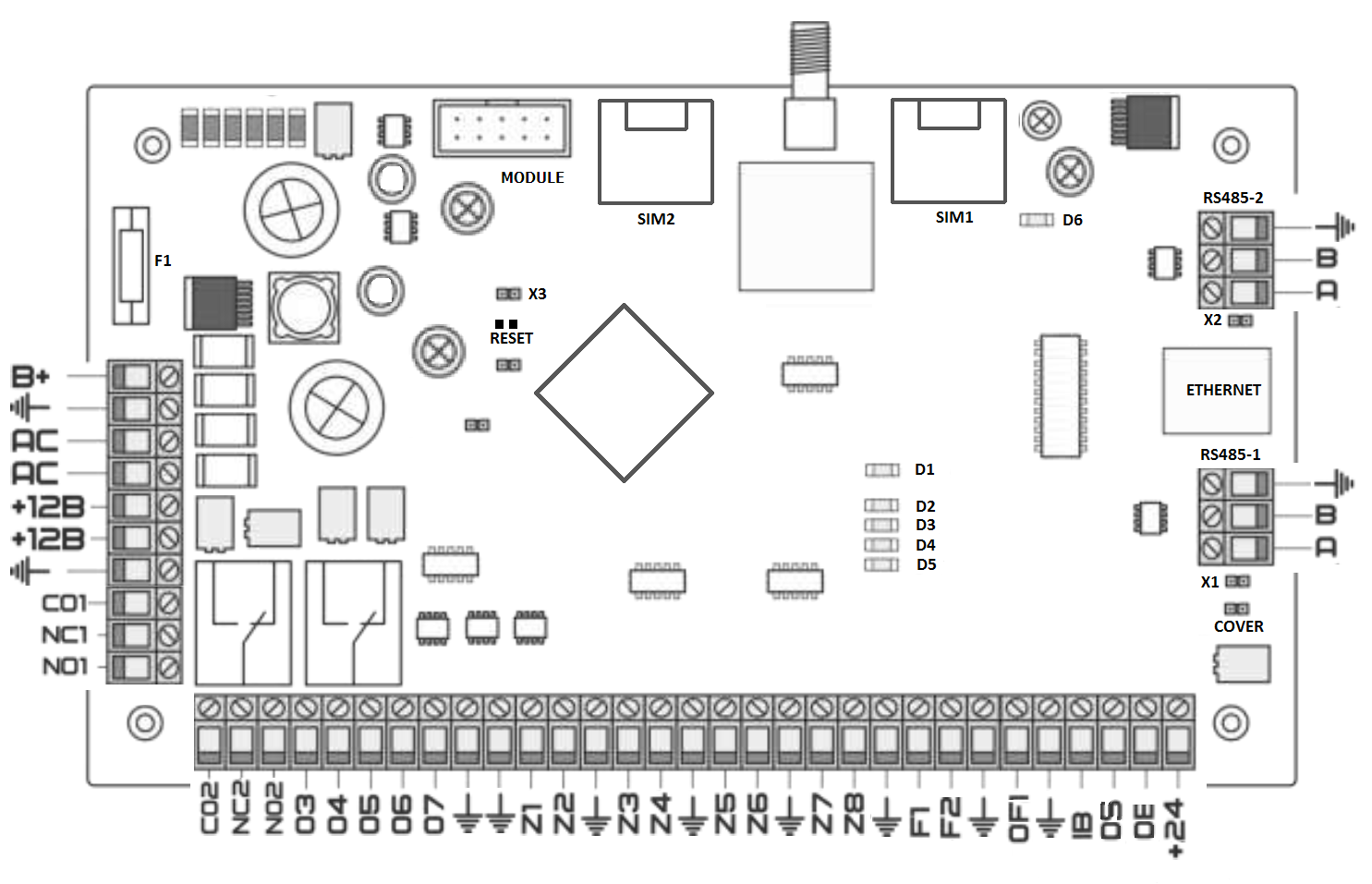 X2 – Перемычка для подключения оконечного резистора 120Ом к шине RS485-2