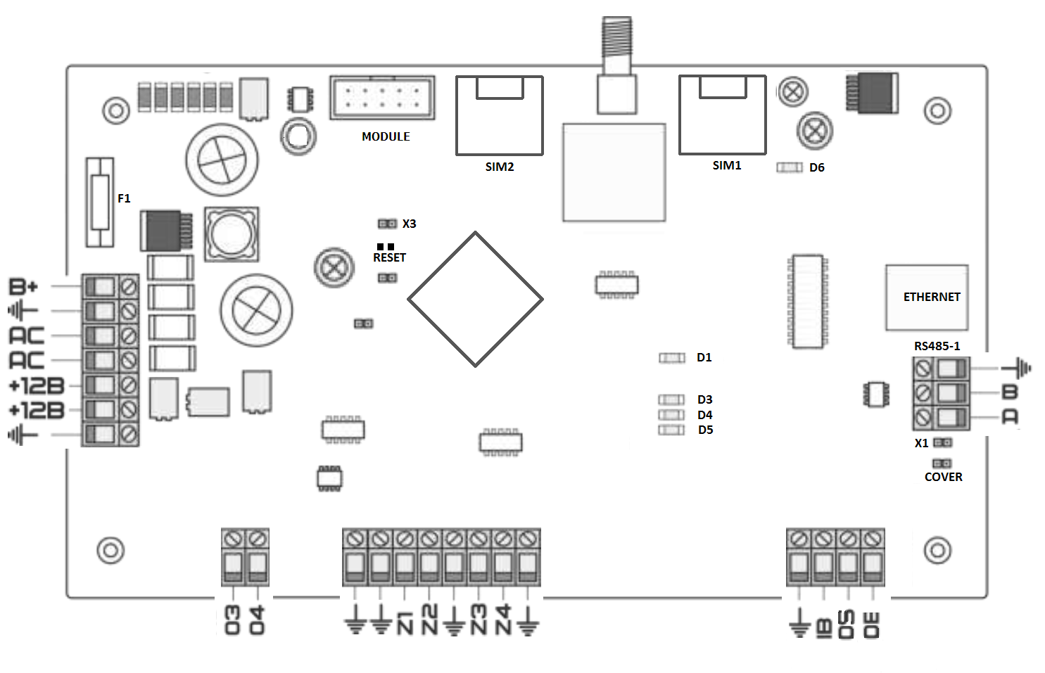 - X1 – Перемычка для подключения оконечного резистора 120Ом к шине RS485-1